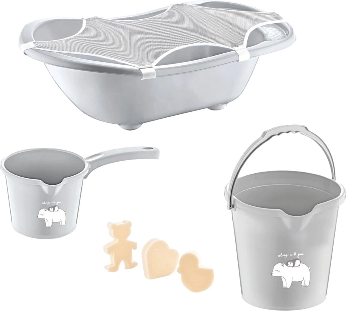 De set wordt geleverd met verschillende accessoires. De spons is lekker zacht, zodat je je kindje goed kan wassen. Tot slot is het badschepje is ideaal om wat water over je kindje te gieten of om zijn/haar haartjes te wassen.