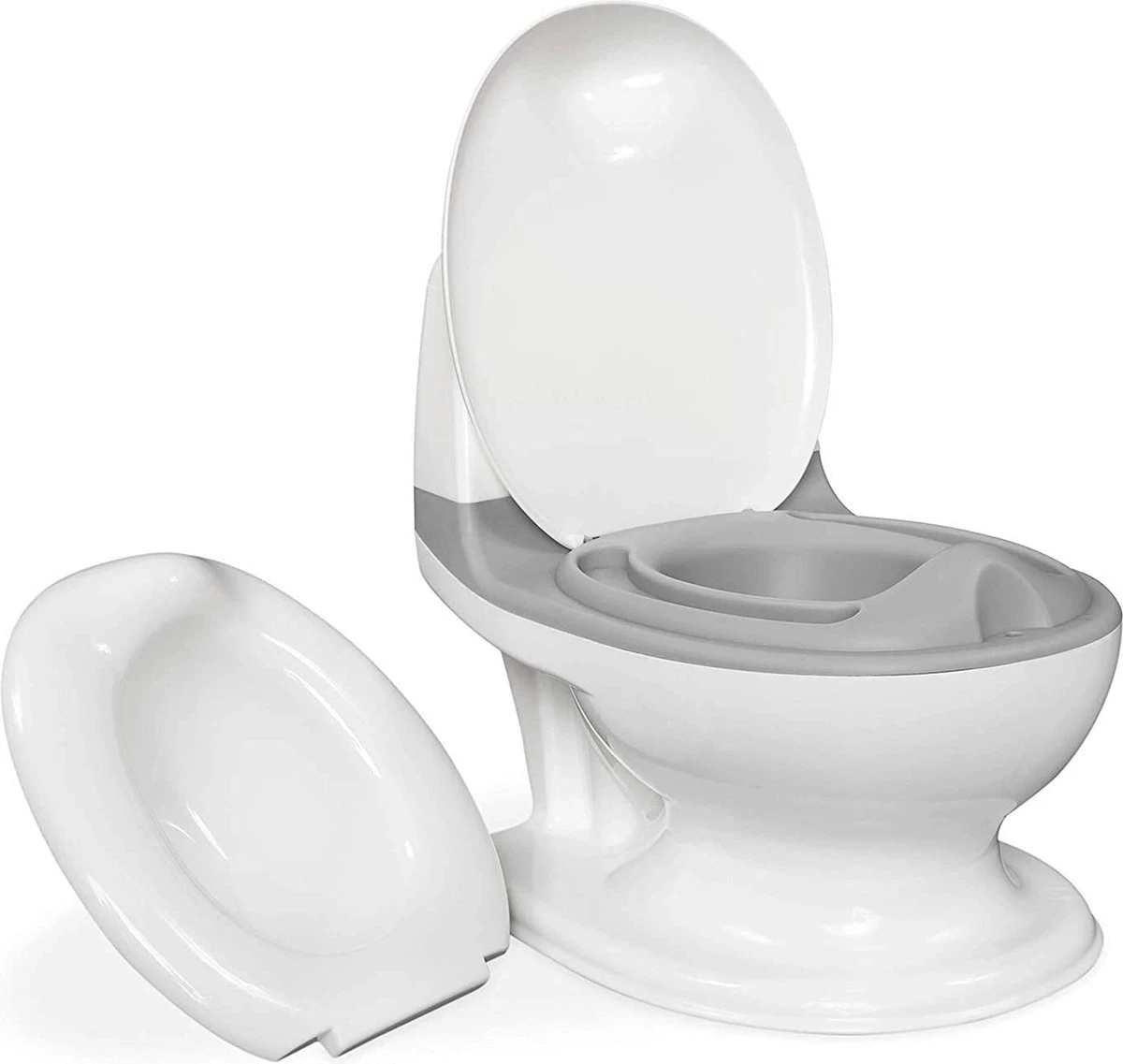 Het peuterpotje met doorspoelgeluid is de perfecte oplossing voor een peuters toilettraining. Enkele van de vele fantastische kenmerken zijn: een levensecht doorspoelgeluid van een toilet, een wc-bril die opent en sluit, en een geïntegreerde spatbescherming die effectief blijft zitten. Daarbovenop beschikt het over een bakje achteraan waar babydoekjes kunnen worden ingestoken en dat vastklikt. Het heeft een anti-slip rubberen basis zodat het niet kan wegslippen terwijl er een trainingsessie aan de gang is, en het potje is verwijderbaar om erg makkelijk schoon te maken. Elk kind is natuurlijk anders, maar wat betreft het starten van potjestraining kan je erop vertrouwen dat peuters makkelijker en sneller vertrokken zullen zijn met dit draagbare toiletje aan hun zijde!
