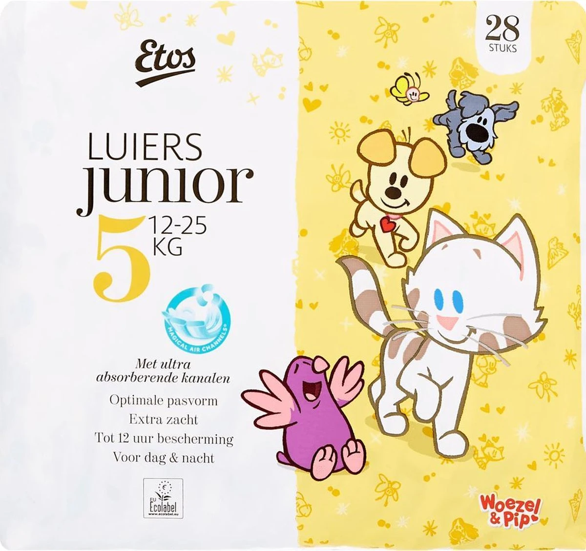 Etos Woezel & Pip Luiers zijn superzachte luiers die de billetjes van je kindje tot wel 12 uur droog houden, zowel overdag als ’s nachts.
