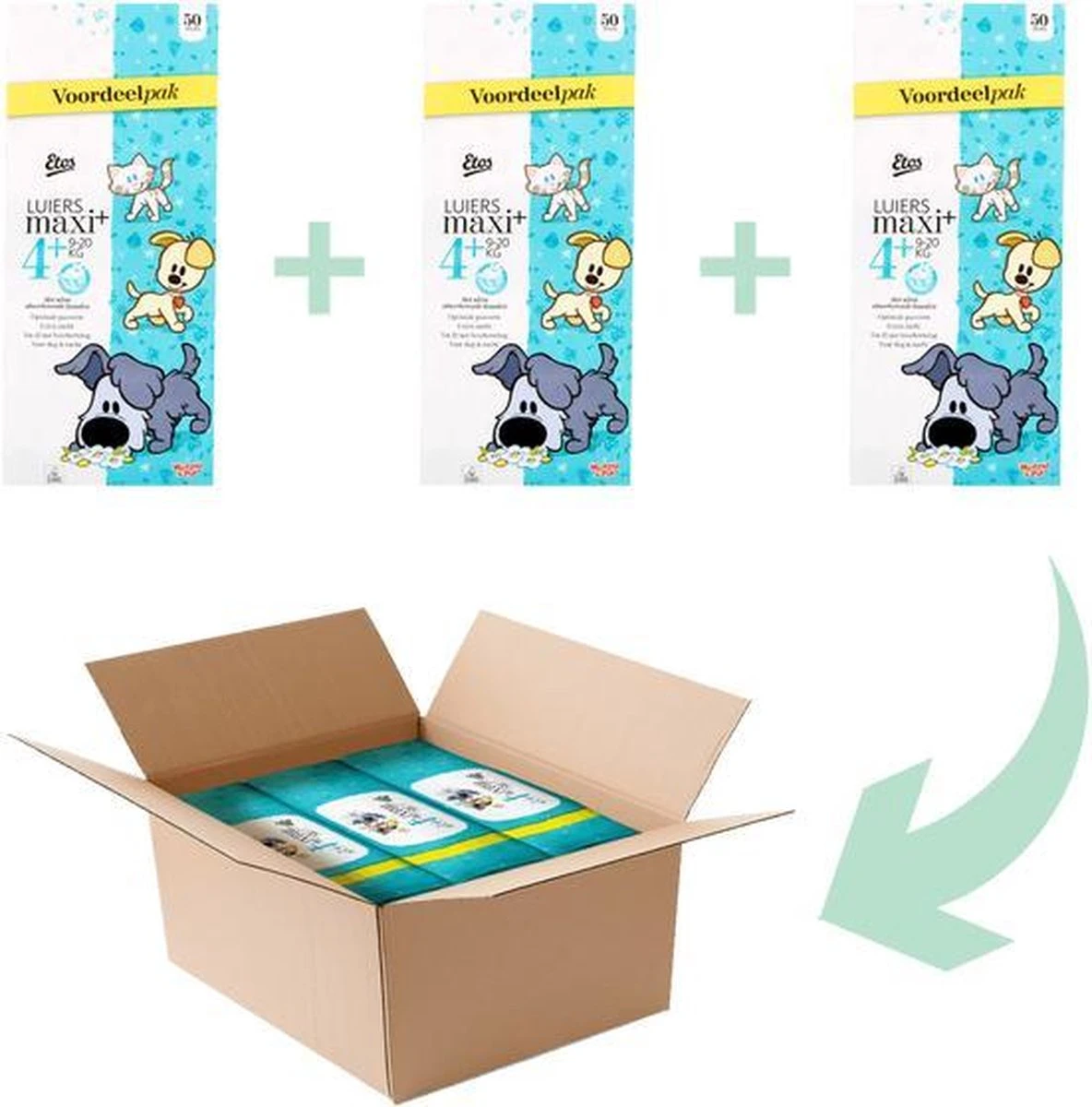 Etos Woezel & Pip Luiers Maxi Plus 4+ zijn geschikt voor kindjes van 9 tot 20 kg.