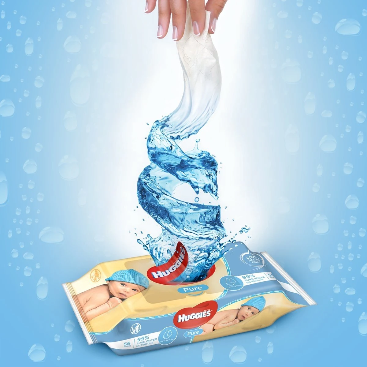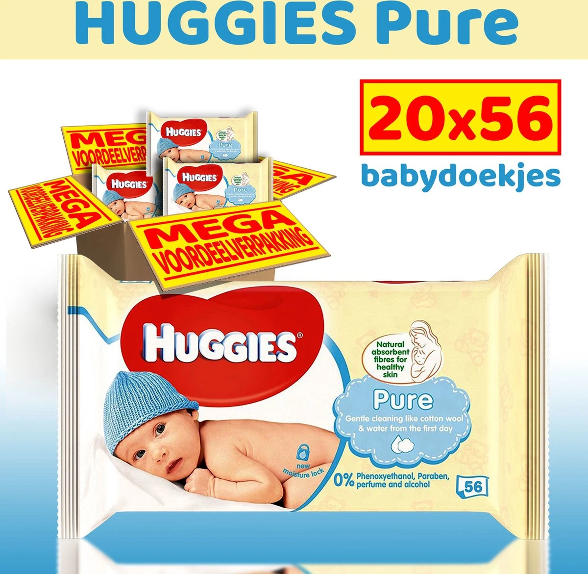 Huggies babydoekjes Pure zijn speciaal ontwikkeld voor de gevoelige huid. Ze zorgen voor een perfecte, zachte reiniging net zoals water en katoen, zelfs geschikt voor pasgeborenen. Zonder geurstof, alcohol en andere overbodige toevoegingen, respecteert de natuurlijke perfectie van je baby’s huidje. Een unieke structuur gemaakt van 65% natuurlijke vezels, zonder parabenen en phenoxyethanol, met 99% puur water zodat deze geen vettig laagje achterlaat op het huidje. Klinisch getest.